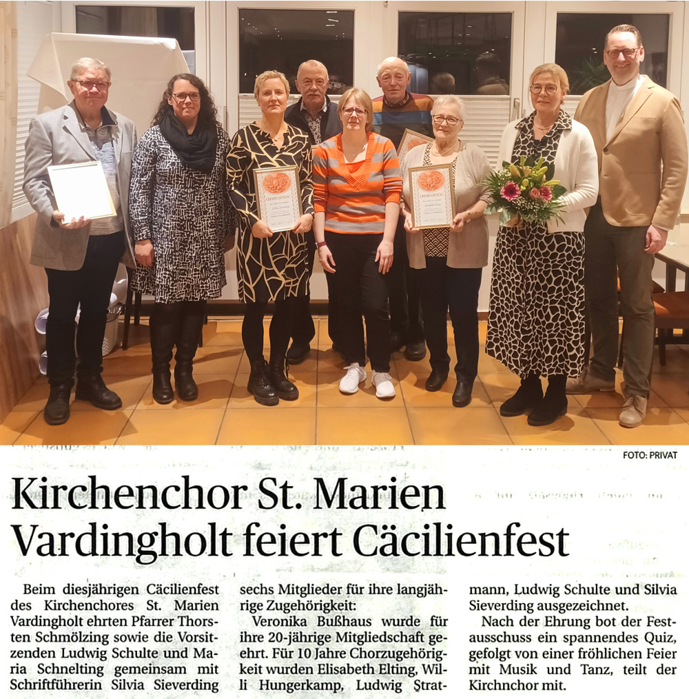 Cäcilienfest in Vardingholt 2024 Beim diesjährigen Cäcilienfest des Kirchenchores St. Marien Vardingholt wurden im Haus Stockhorst für Ihre Treue 6 aktive Mitglieder vom Präses Pfarrer Thorsten Schmölzing geehrt.