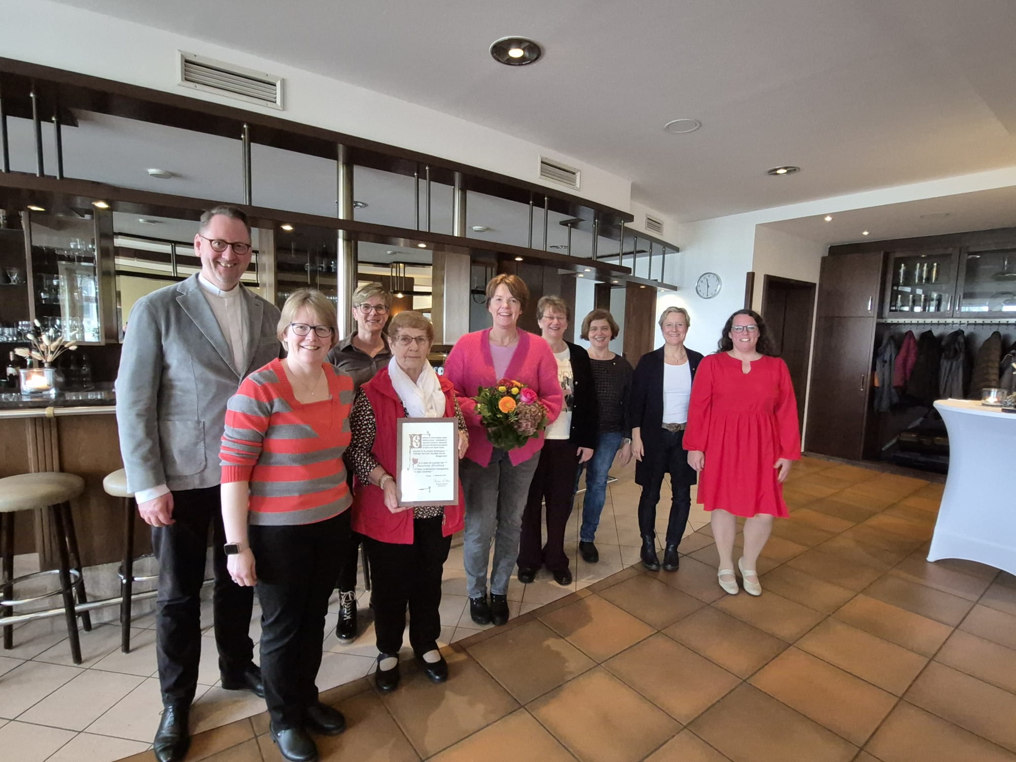 Beim Cäcilienfest am Samstagabend ehrte der Kirchenchor St. Marien langjährige Mitglieder. Diese Aufgabe übernahm Präses Pfarrer Schmölzing zusammen mit dem ersten Vorsitzenden Ludwig Schulte und der Schriftführerin Anne Wewering. Seit 25 Jahren singen Ingrid Benson, Gisela Hungerkamp, Luzi Klein-Heßling und Brigitte Möllmann im Chor. Sie erhielten eine Urkunde vom Diözesan-Cäcilienverband für ihre langjährige Zugehörigkeit. Christa Hundewick ist seit 20 Jahren dabei und wurde mit einem Blumenstrauß geehrt. Mechtild Resing und Maria Schnelting erhielten ebenfalls eine Urkunde für ihre 10jährige Chorverbundenheit.